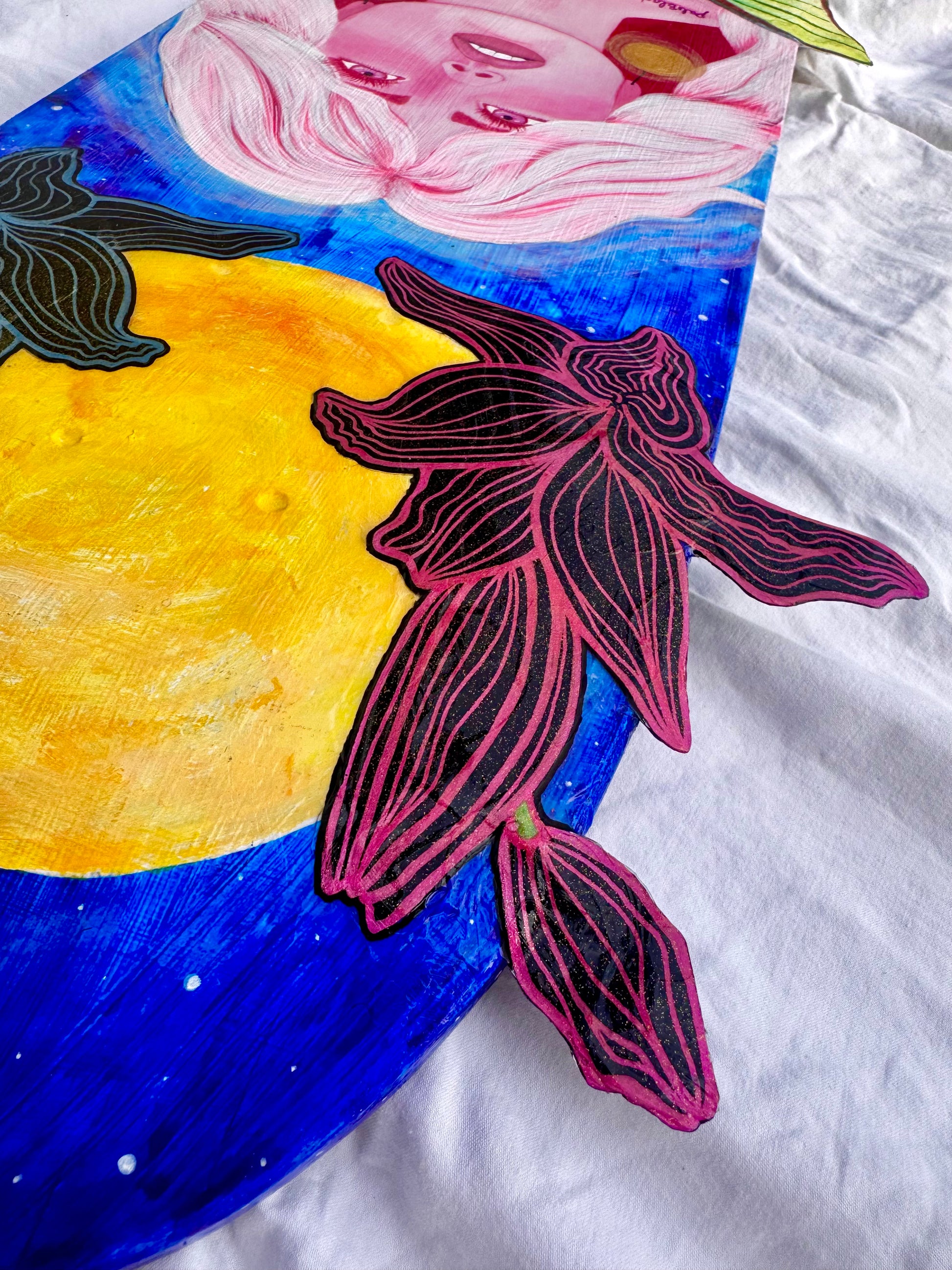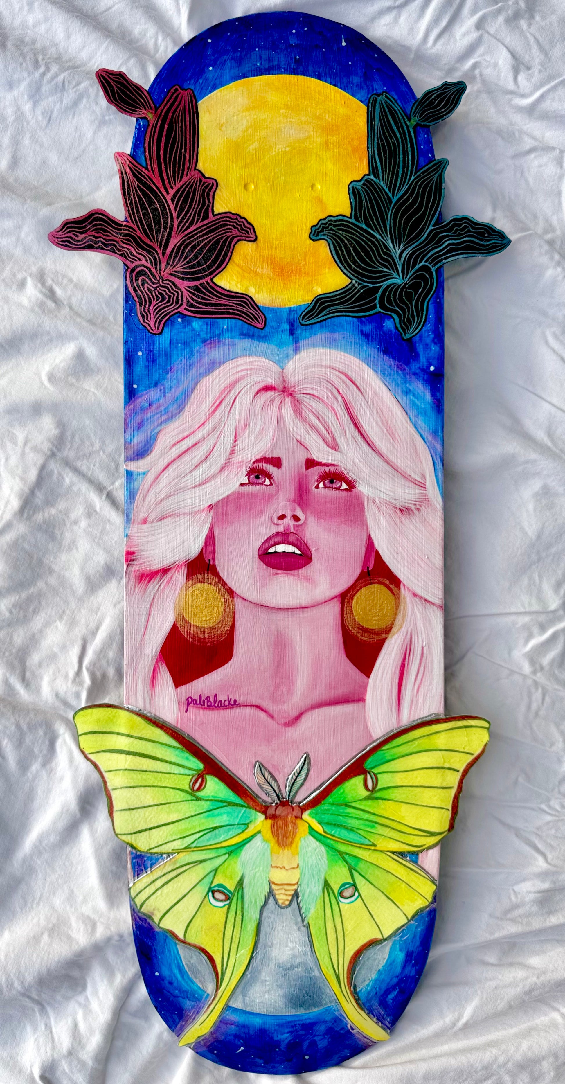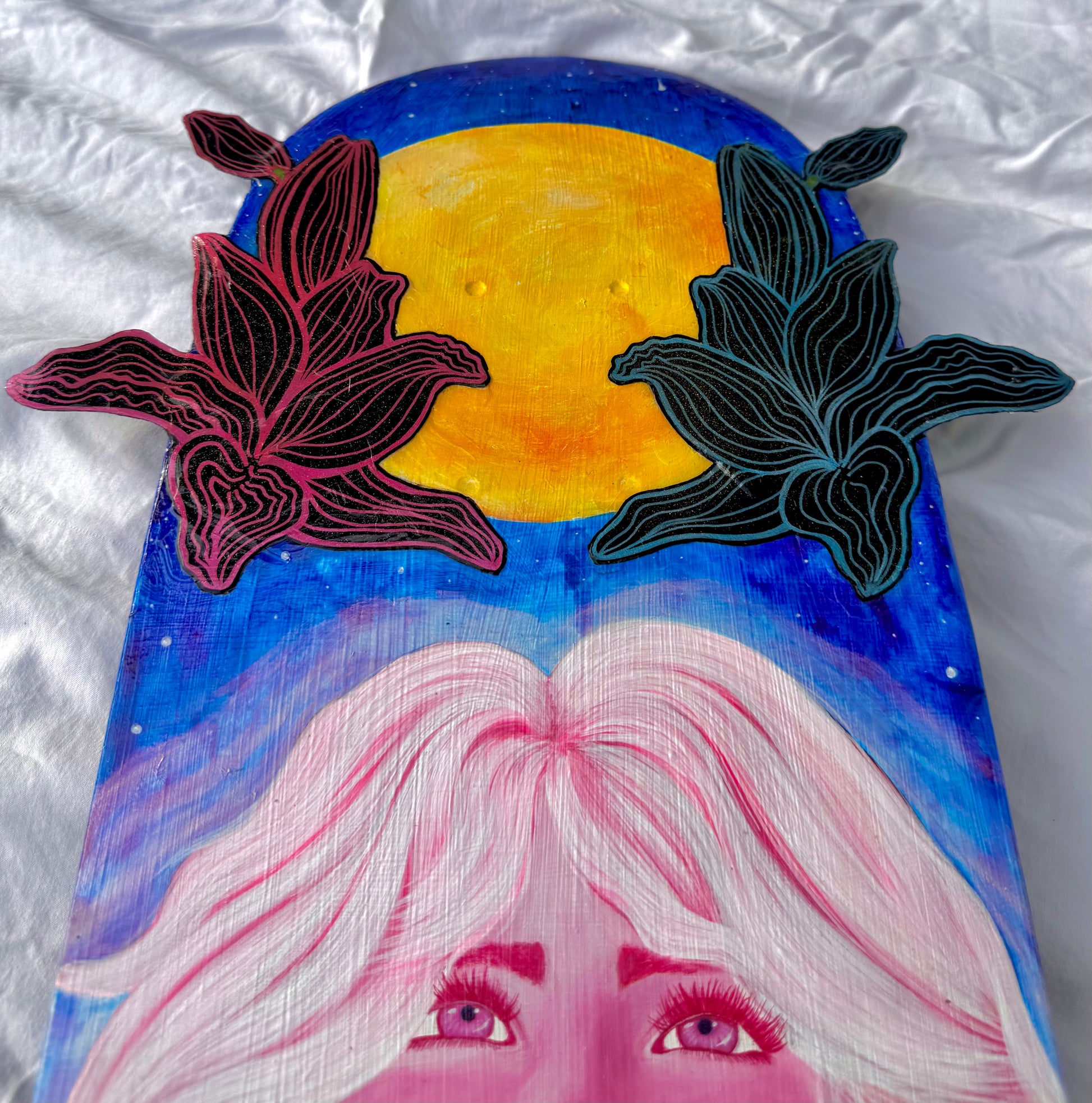 Cette œuvre se veut une représentation d’une rêveuse qui fait confiance à son intuition. L’espoir, le regard vers le ciel, vers le soleil. Même avec l’incertitude et la noirceur de la nuit on continue de se laisser guider par son cœur.